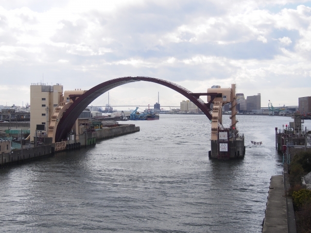 大阪は海抜の低い地域が多く、台風などによる高潮被害を防ぐため、安治川・尻無川・木津川の河口に水門が整備されています。