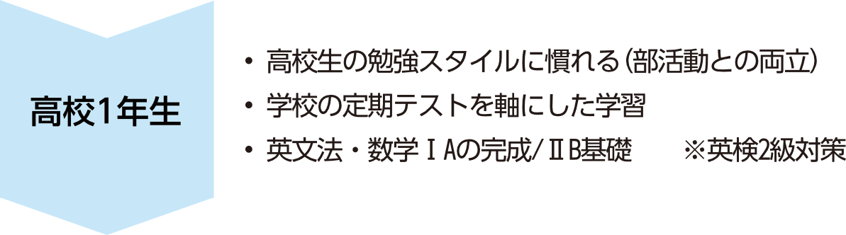 部活動も忙しくなる一方で、大学受験にも意識を向けなくてはなりません。当塾では、高2より[学校の学習を中心に進めるクラス]と[大学受験準備を始めるクラス]に分かれ、無理なく、着実に実力をつける指導を進めます。