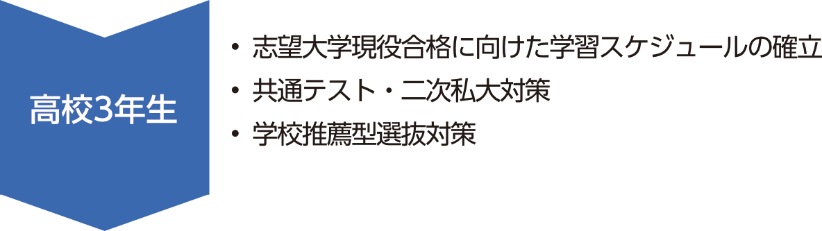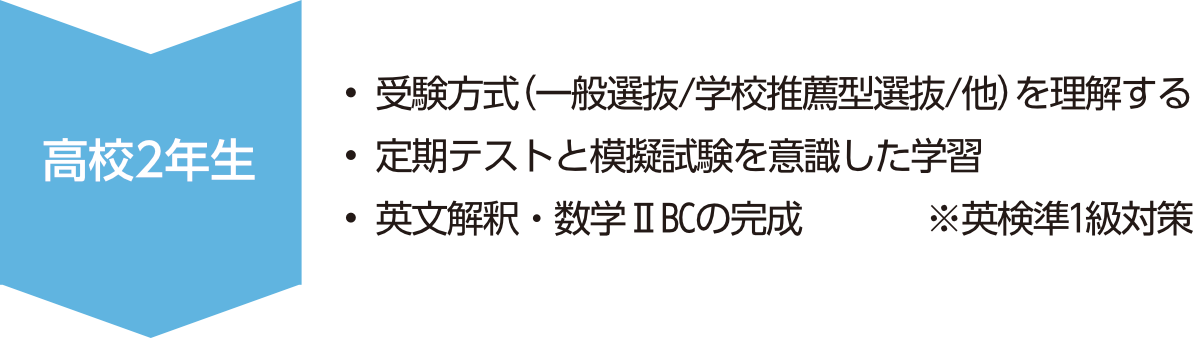 部活動も忙しくなる一方で、大学受験にも意識を向けなくてはなりません。当塾では、高2より[学校の学習を中心に進めるクラス]と[大学受験準備を始めるクラス]に分かれ、無理なく、着実に実力をつける指導を進めます。